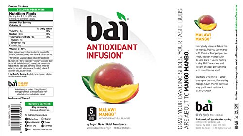 Bai Antioxidant Infusion, Malawi Mango: Calories, Nutrition ... - Fooducate Erythritol is only 60% as sweet as regular sugar. It has almost no calories - only 0.2 calories per gram vs. 4 calories for sugar (1/20th of the calories!). An advantage Erythritol has over other sugar alcohols is that it is absorbed by the body and therefore does not cause cramps or bloating. Natural flavors added.