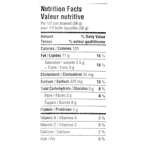 Nutrition Facts for Maple Leaf Vienna Sausages - MyFoodDiary Maple Leaf Vienna Sausages Canned Nutrition Facts Serving Size can 0.5 can = 56g Amount Per Serving 120 Calories % Daily Value* 17% Total Fat 11g 18% Saturated Fat 3.5g Trans Fat 0g 15% Cholesterol 45mg 14% Sodium 320mg 0% Total Carbohydrate 0g 0% Dietary Fiber 0g Total Sugars 0g 0% Includes 0g Added Sugars Protein 5g 2% Calcium 20mg 6% Iron 1.1mg