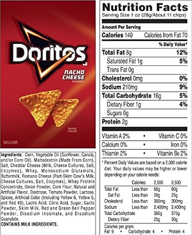 Doritos Reduced Fat NACHO CHEESE Flavored Tortilla Chips Calories - At this serving size there are 130 Calories per serving. A closer look shows: 45 Calories from Fat, 8 Calories from Protein, and 76 Calories from Carbohydrate. If you're keeping track, a good calorie counter can make this easy -- see the software below. fastfoodnutrition.org › taco-bellTaco Bell Nutrition Facts - FastFoodNutrition.org May 21, 2022 · Taco Bell Nutrition Facts. Nutrition facts for the full Taco Bell menu. Select any item to view the complete nutritional information including calories, carbs, sodium and Weight Watchers points. You can also use our calorie filter to find the Taco Bell menu item that best fits your diet. Share = Voted a healthy and tasty option. Calories in Doritos Tortilla Chips, Reduced Fat, Cool Ranch ... Comprehensive nutrition resource for Doritos Tortilla Chips, Reduced Fat, Cool Ranch. Learn about the number of calories and nutritional and diet information for Doritos Tortilla Chips, Reduced Fat, Cool Ranch. This is part of our comprehensive database of 40,000 foods including foods from hundreds of popular restaurants and thousands of brands. Calories in Doritos Tortilla Chips, Reduced Fat, Spicy Sweet ... - Fitbit Comprehensive nutrition resource for Doritos Tortilla Chips, Reduced Fat, Spicy Sweet Chili. Learn about the number of calories and nutritional and diet information for Doritos Tortilla Chips, Reduced Fat, Spicy Sweet Chili. This is part of our comprehensive database of 40,000 foods including foods from hundreds of popular restaurants and thousands of brands.