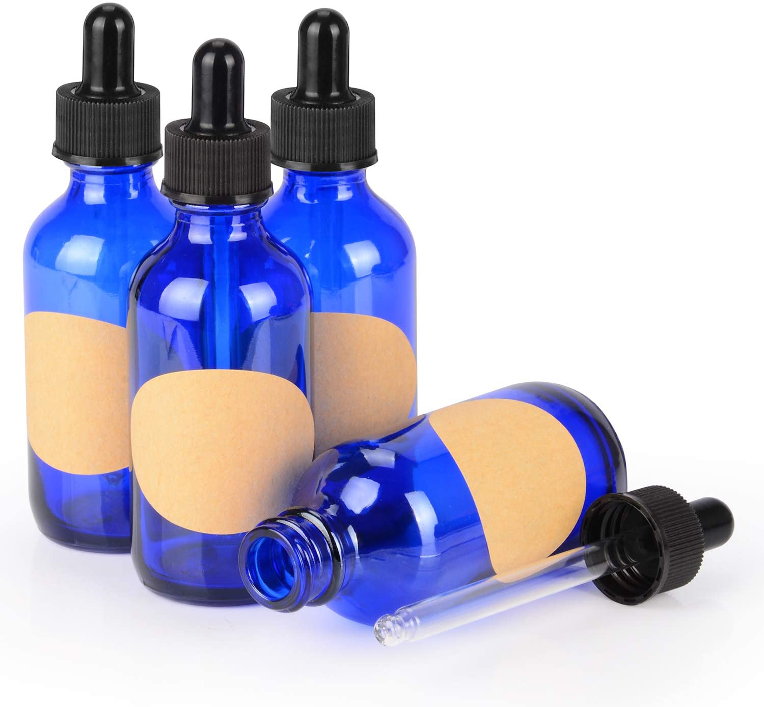 Cobalt Glass Dropper Bottle 60ml (2 oz) 4 Pack, Blue Empty Glass Bottle with Glass Dropper and Label for Essential Oils Aromatherapy Fragrances