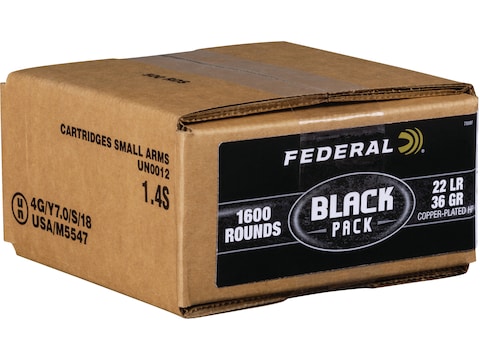 Federal Black Pack .22 LR 36gr Copper Plated HP 1600 Rd - Ammo Description Federal Black Pack .22 LR 36gr Copper Plated HP 1600 Rd These .22 Long Rifle loads utilize 36-grain copper-plated hollow point (CPHP) bullets which have similar flight ballistics to a wide range of practice and hunting options for the caliber.