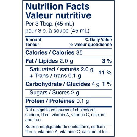 Nutrition Facts for Cool Whip Original Whipped Topping Cool Whip Original Whipped Topping Nutrition Facts Serving Size tbsp 2 tbsp = 9g Amount Per Serving 25 Calories % Daily Value* 2% Total Fat 1.5g 5% Saturated Fat 1g Trans Fat 0g 0% Cholesterol 0mg 0% Sodium 0mg 1% Total Carbohydrate 3g 0% Dietary Fiber 0g Total Sugars 2g 4% Includes 2g Added Sugars Protein 0g 0% Vitamin D 0mcg 0% Calcium 0mg
