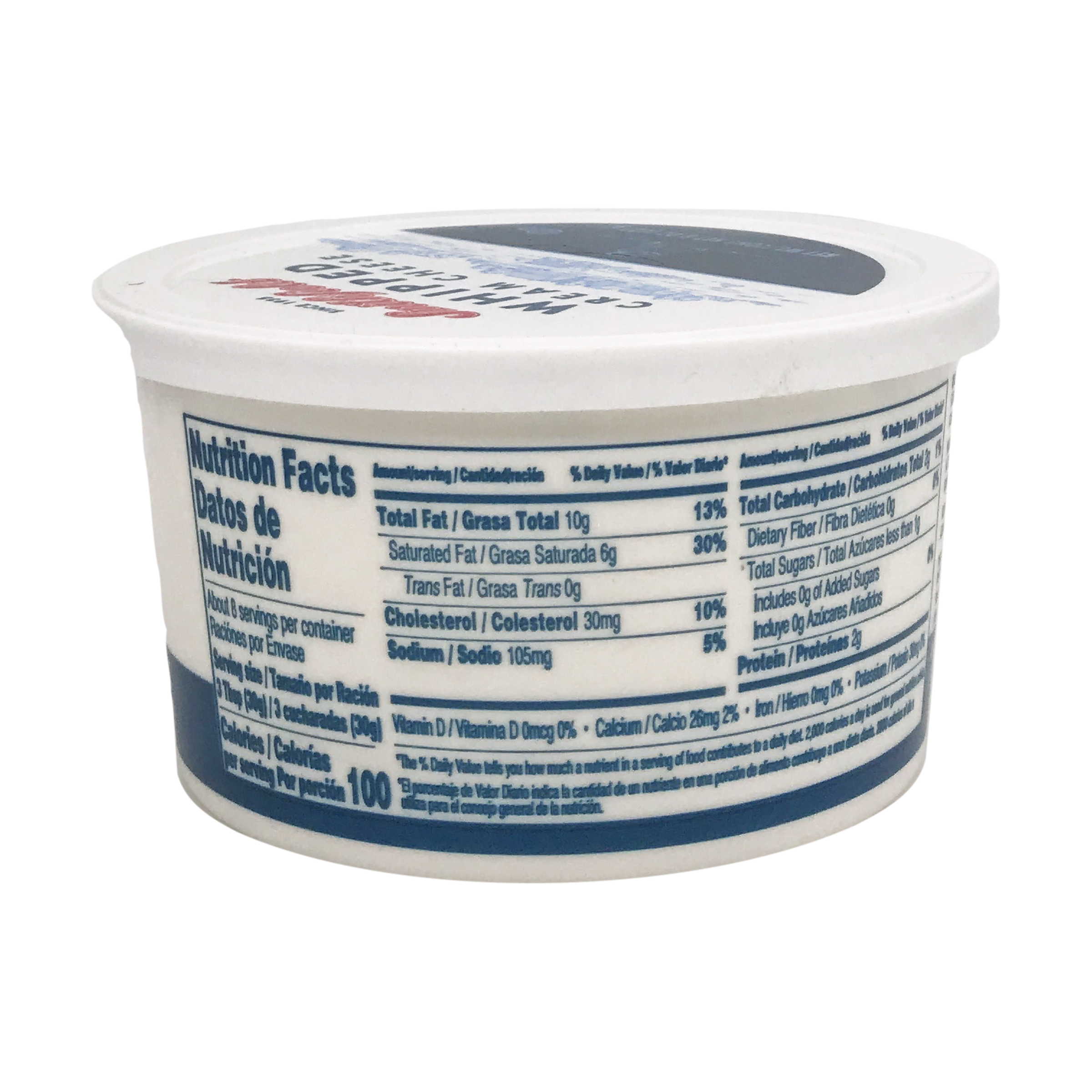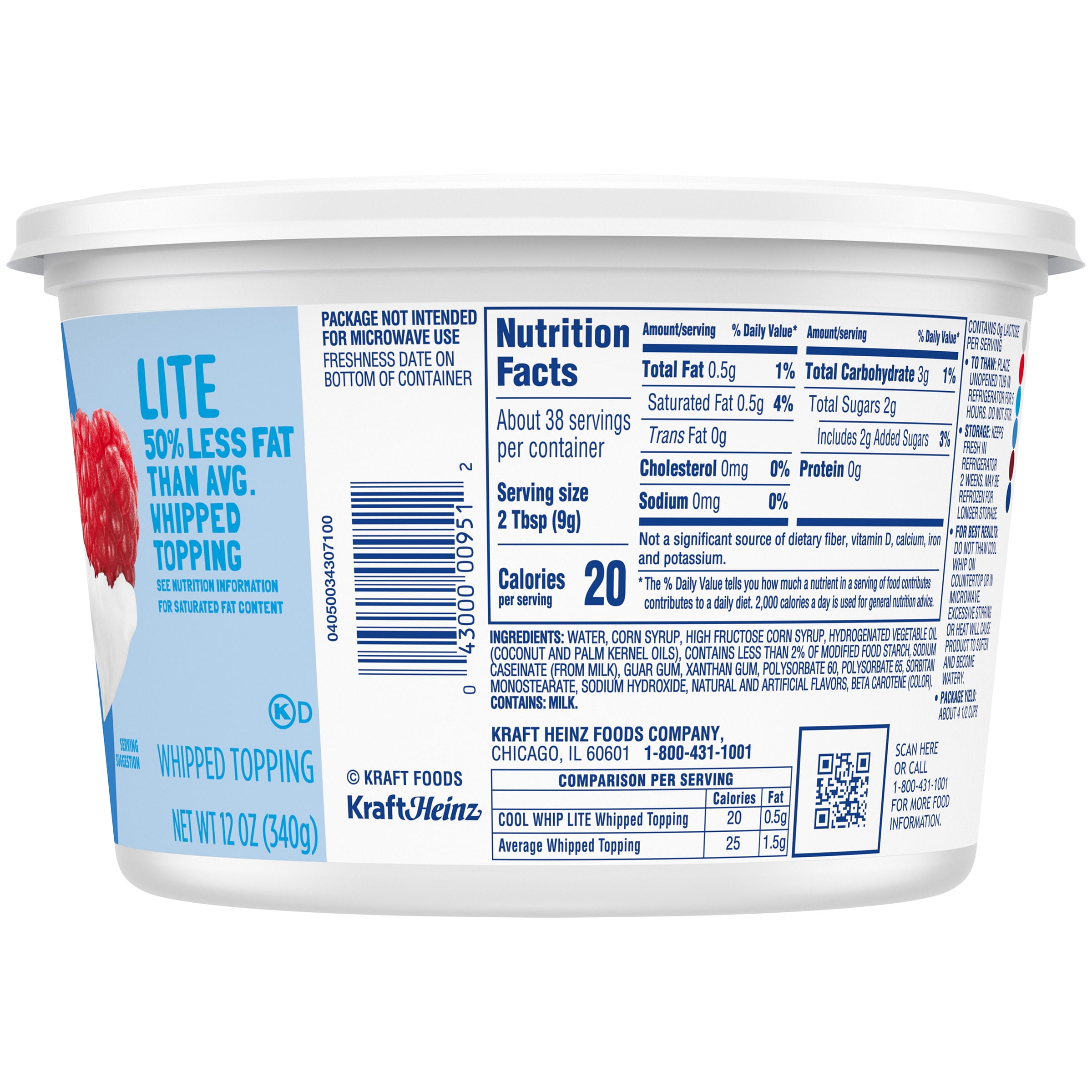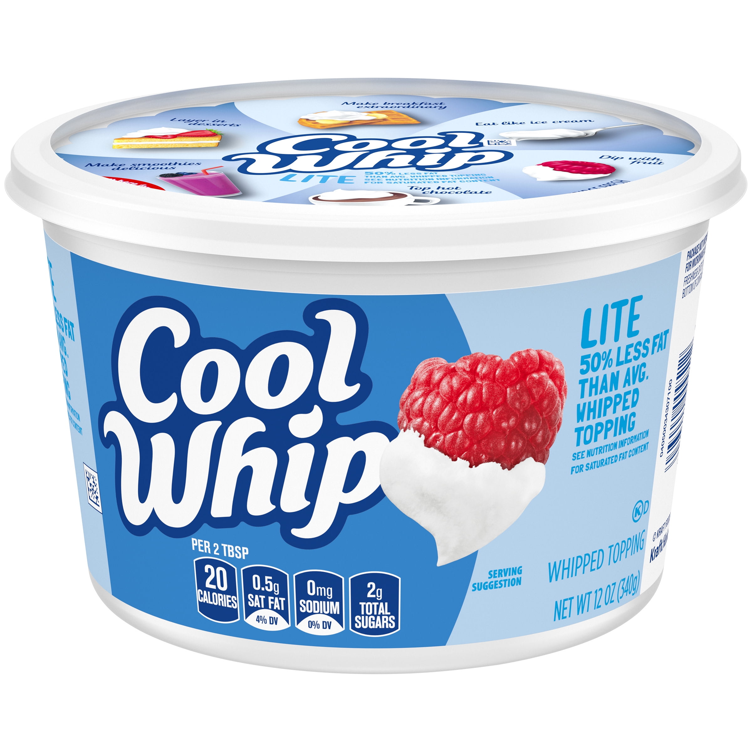 Kraft Cool Whip Extra Creamy - - Online Groceries | Safeway Extra Creamy Whipped Topping. Per 2 Tbsp: 30 calories; 2 g sat fat (10% DV); 0 mg sodium (0% DV); 2 g total sugars. Contains 0 g lactose per serving. Made with real cream. Fridge fresh for 2 weeks. Package Yield: About 3 cups. Package not intended for microwave use. Scan or call 1-800-431-1004 for more food information. Cool Whip Extra Creamy ...