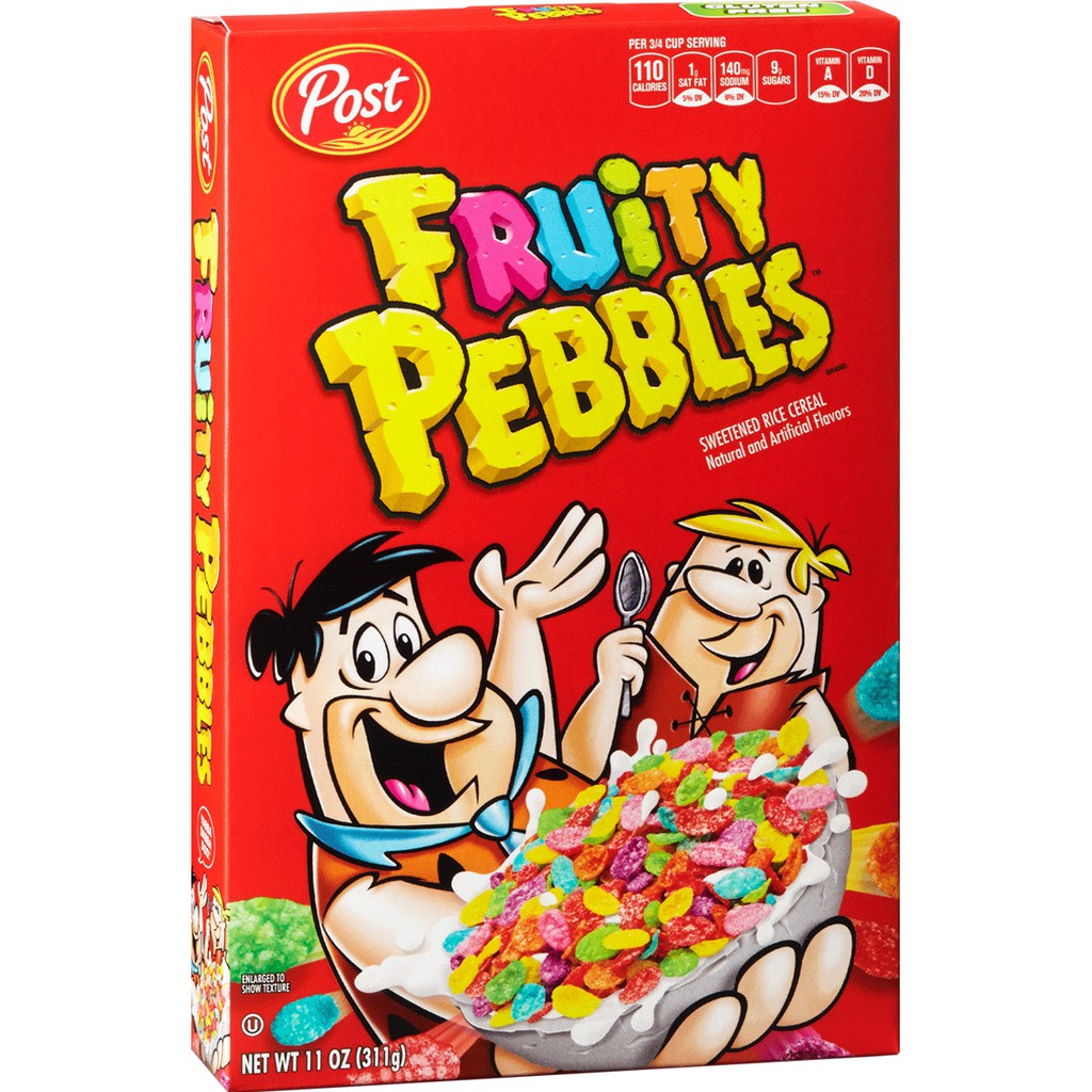 Post Fruity Pebbles Cereal Family Size - HEB Nutrition Facts. Fruity Pebbles Cereal Family Size. Serving Size 0.75 cup(27g) Serving Per Container about 24 (cereal). Amount Per Serving ... Carbs in Fruity Pebbles Fruity Pebbles (0.75 cup) contains 23g total carbs, 23g net carbs, 1g fat, 1g protein, and 110 calories.