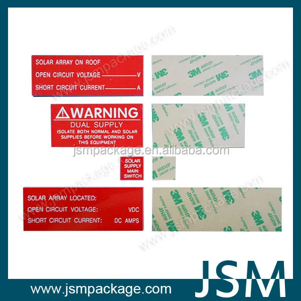 NEC 2011 Compliant Label: Photovoltaic Power Source Label Pre-Printed Reflective Solar Labels are made using high performance UV stable materials and adhesives. Designed to meet NEC and IFC standards for PV installation labeling, the pre-printed Reflective Solar labels come printed with the most common legends required by the AHJ (Authority Having Jurisdiction) used on large utility and scaled projects. Solar Warning Labels | USA | Solar Panel System Solar Warning Labels offers a wide range of labels for solar panel users. This is a website where you can find different products for solar labeling. Contact Us: 888-705-0506. 0. ... All the stickers, labels, safety signs, and decals display the key messages with a readable font, catching the user's attention at first sight. ... Solar Placards, PV Labels, Solar Warning Signs — VE Signs Inc Our solar warning labels and placards are made in the USA at our Riverside, CA facility using UL rated polymer plastic with an acrylic core that can survive the outdoors for years. A strong 3M adhesive backing is standard for all our solar PV labels!