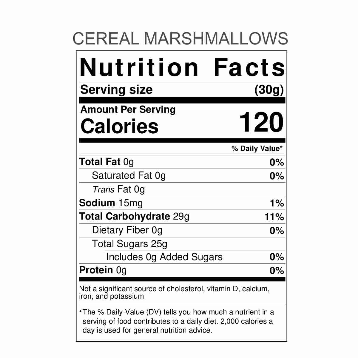 Nutrition Facts for Great Value Mini Fruit Marshmallows Mini Fruit Marshmallows. Nutrition Facts. Serving Size. cup. 2/3 cup = 30g. Amount Per Serving. 100. Calories % Daily Value* 0%. Total Fat 0g. ... 24 Net Carbs Per Serving Add to Food Diary. Eat better. Feel better. Learn more MyFoodDiary. Burn 100 Calories. 18.4 minutes Walking at 17 min/mile. Amazon.com: individual marshmallow packets Jet-Puffed Mini Marshmallows (16 oz Bags, Pack of 12) 16 Ounce (Pack of 12) 199 112 Piece FireStix S'Mores Kit - Makes Up to 24 S'Mores - Includes 30" Roasting Sticks, Chocolate, Graham Crackers, and Marshmallows - Perfect for Camping, Outdoor Fire Pits, Birthday Parties 121 $3299 Save more with Subscribe & Save Get it as soon as Fri, Jul 29 Mini Marshmallow Packs - 12 CT Box • Kosher Marshmallows - Oh! Nuts® Buy and Save on Cheap Mini Marshmallow Packs - 12 CT Box at Wholesale Prices. Offering a large selection of Mini Marshmallow Packs - 12 CT Box. Cheap Prices on all Bulk Nuts, Bulk Candy & Bulk Chocolate. ... Serving Size. 1 oz. Servings per Container 24. Amount per Serving. Calories 90 % Daily Value * Total Fat 0g. 0%. Saturated Fat. Trans Fat ...