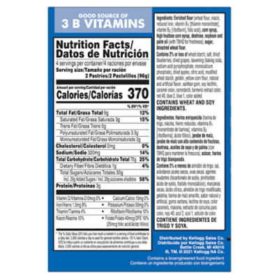 Nutrition Facts for Pop-Tarts Unfrosted Blueberry Toaster Pastries ... Nutrition Facts Serving Size pastries 2 pastries = 96g Amount Per Serving 380 Calories % Daily Value* 15% Total Fat 10g 18% Saturated Fat 3.5g Trans Fat 0g 0% Cholesterol 0mg 16% Sodium 360mg 23% Total Carbohydrate 69g 4% Dietary Fiber 1g Total Sugars 25g 48% Includes 24g Added Sugars Protein 4g 0% Vitamin D 0mcg 0% Calcium 0mg 8% Iron 1.5mg