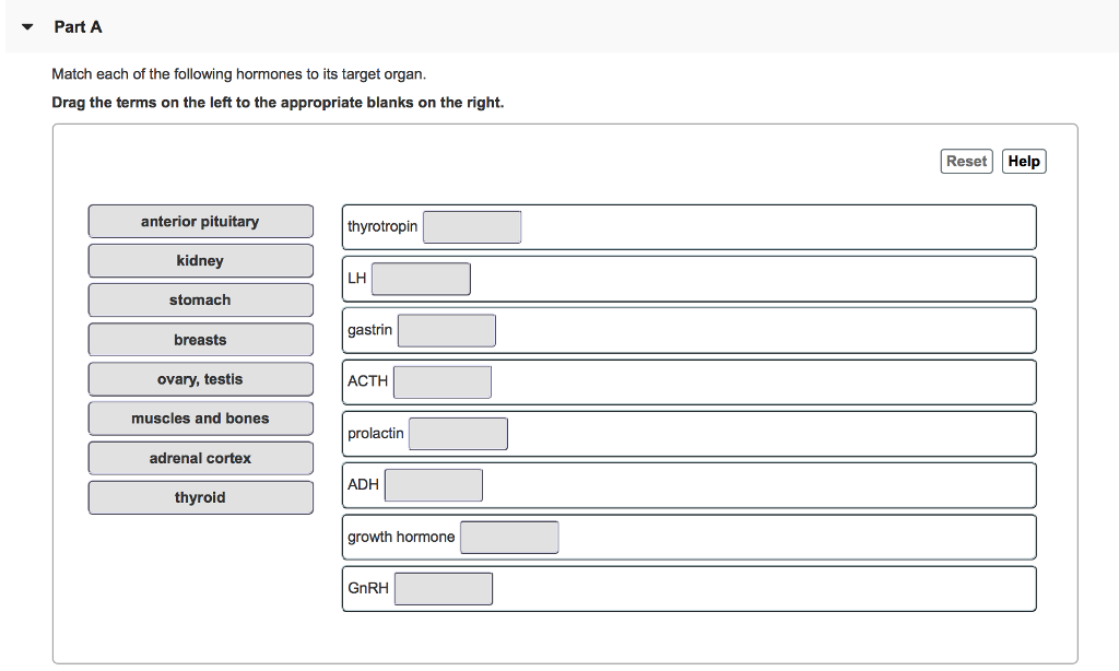 Anatomy And Physiology Chapter 17 Flashcards | Quizlet Growth hormone _____ _____, Match the target tissue with the hormone secreted by the anterior pituitary gland. ... Drag each label to identify which hormones would be responsible for each description. STEROID MONOAMINE PEPTIDE - ADRENOCORTICOTROPIC HORMONE - ANGIOTENSIN - GLUCAGON - NOREPINEPHRINE - ESTRONE - CORTISOL Solved Drag each label to identify which glands would be - Chegg Question: Drag each label to identify which glands would be responsible for each descriptive role or function. Each gland may have more than one match, so be sure to place all descriptions. ENDOCRINE WORKSHEET Flashcards | Quizlet Click and drag each hormone or scenario into the appropriate stage of the stress response. Hormones are chemical messengers that are transported by the bloodstream and stimulate physiological responses in cells of another tissue or organ. Choose the accurate statement (s) about how communication by the nervous and endocrine systems differ. Hormones and the Endocrine System | Johns Hopkins Medicine The endocrine system uses hormones to control and coordinate your body's internal metabolism (or homeostasis) energy level, reproduction, growth and development, and response to injury, stress, and environmental factors. Consider the following hormones and their role in the workings of the endocrine system: