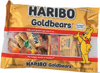 Haribo Goldbears Original Gummy Bears Bag, 8 Oz - Walmart.com HARIBO GOLDBEARS® have been the gummy candy gold standard worldwide for over 90 years. Kids and grown-ups love it so, the happy world of HARIBO! Package of 1 8 oz bag. Sweet treats in five fruity flavors: Lemon (yellow), Orange (orange), Pineapple (white), Raspberry (red), Strawberry (green) Fat free gummy bear candy. 100 calories per serving.