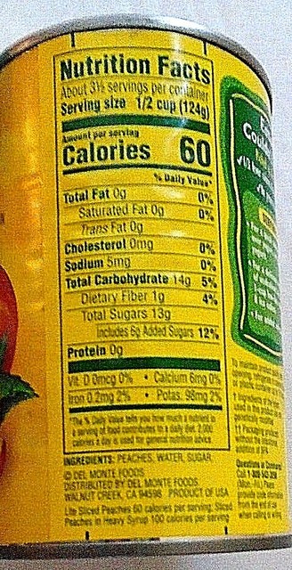 Sliced Yellow Cling Peaches - No Sugar Added | Del Monte® Peaches, Water, Ascorbic Acid (Vitamin C), Acesulfame Potassium, Sucralose. Undrained Nutrition Item Left Value Right Value Serving Size 1/2 cup (121g) Amount Per Serving 1/2 cup Calories 35 Calories From Fat 0 Total Fat 0g 0% Saturated Fat 0g 0% Trans Fat 0g 0% Cholesterol 0mg 0% Sodium 5mg 0% Potassium 100mg 3% Total Carbohydrates 8g 3%
