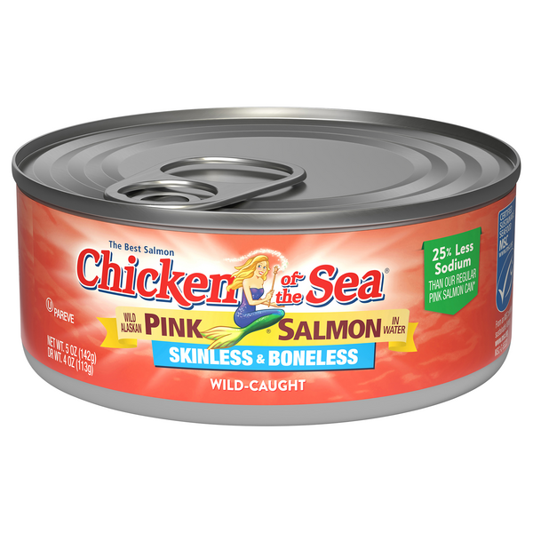 Canned Pink Salmon Traditional Style | Chicken of the Sea Wild-caught pink salmon has a deliciously mild flavor that's perfect in so many dishes—from light salads to comfort-food favorites. Available Sizes: 14.75 oz Nutrition Facts * Supportive but not conclusive research shows that consumption of EPA and DHA Omega-3 fatty acids may reduce the risk of coronary heart disease.