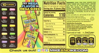 Mike & Ike Original Fruits Candy Theater Box - H-E-B Mike & Ike Original Fruits Candy Theater Box ; Sodium 10mg, 0% ; Total Carbohydrate 27g, 10% ; Total Sugars 18g ; Added Sugars 18g, 36% ... Save on Mike & Ike Fruit Candy Original Order Online Delivery | Giant Mike & Ike Fruit Candy Original ; Calories: 110 ; Total Fat: 0g 0 ; Saturated Fat: 0g 0 ; Trans Fat: 0g ; Trans Fat ...