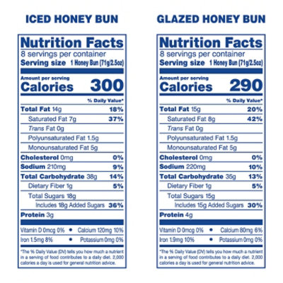 Calories in Hostess Frosted Honey Bun - Nutrition Facts - Fitbit Frosted Honey Bun from Hostess Nutrition Facts Serving Size 1 serving Amount Per Serving Calories 410 Calories from Fat 220 % Daily Value * Total Fat 24g 37% Saturated Fat 11g 55% Trans Fat 0g Cholesterol 20mg 7% Sodium 270mg 11% Potassium 0mg 0% Total Carbohydrate 42g 14% Dietary Fiber 1g 4% Sugars 31g Protein 5g 10% Calories in Duchess Frosted honey bun. Nutrition Facts ... Find Out How Many Calories Are In Duchess Frosted Honey Bun, Good or Bad Points and Other Nutrition Facts about it. Take a look at Duchess Frosted Honey Bun related products and other millions of foods. Frosted Honey Bun calories, carbs & nutrition facts ... Frosted Honey Bun. Serving Size: 1 bun. 690 Cal. 33% 58g Carbs. 63% 49g Fat. 3% 6g Protein. Track macros, calories, and more with MyFitnessPal. Join for free! Daily Goals