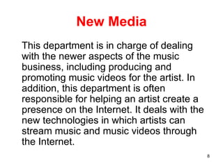 Structure and breakdown of Record Labels - SlideShare Structure Of A Major Record Label jackiemason 24.5k views • 12 slides Record label structure Stefan_Mekki 7.9k views • 12 slides Recording industry analysis JRolix 1.2k views • 21 slides Breakdown of Record Labels jadewhyatt 1k views • 10 slides Independent Record Companies Christopher Baker 1.5k views • 14 slides Music Industry reigatemedia