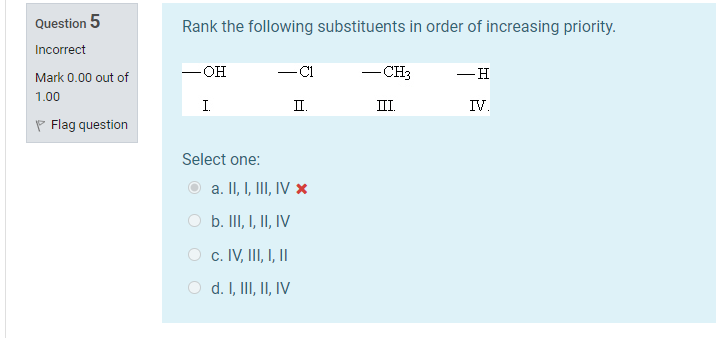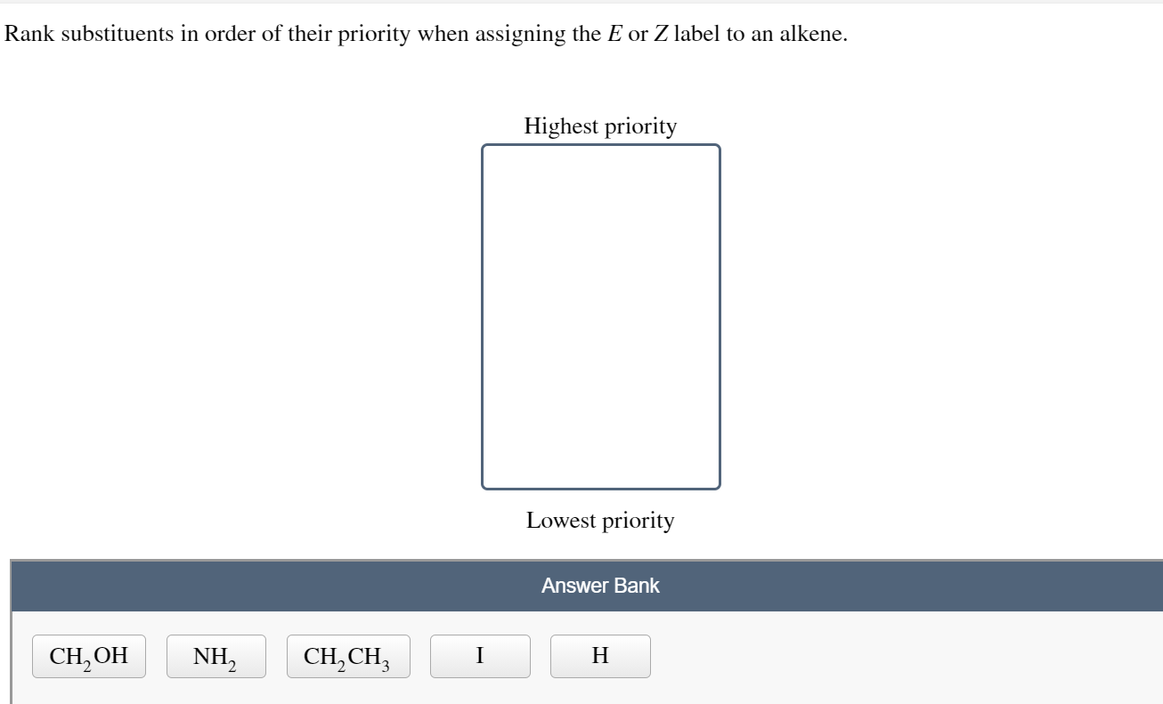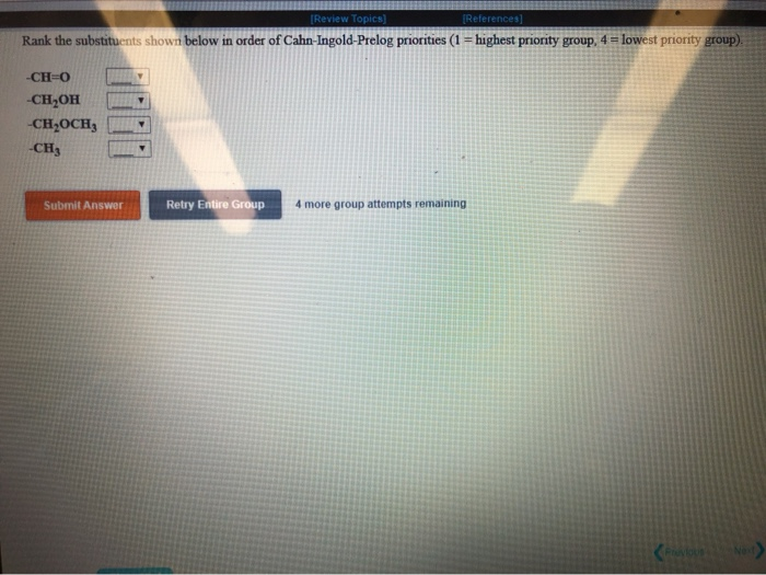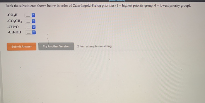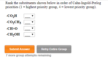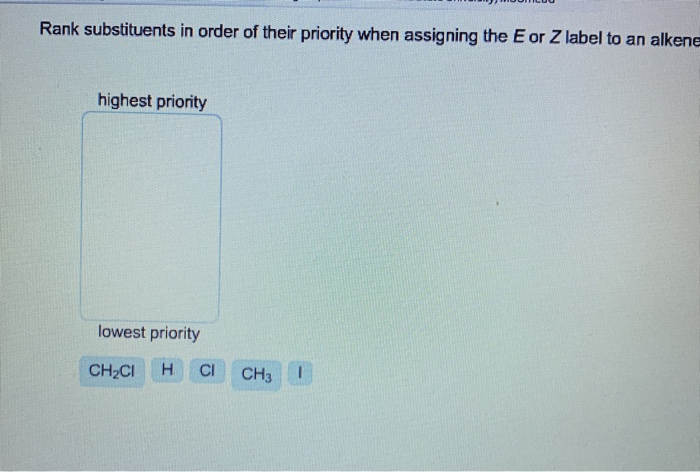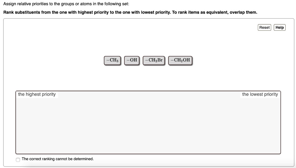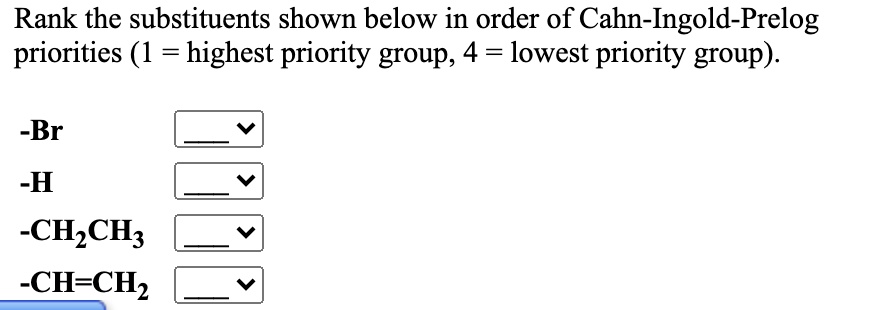 How to rank substituents in order of priority. 18.2: Functional Group Order of Precedence For Organic Nomenclature 1. CARBOXYLIC ACIDS (highest priority among carbon-containing functional groups). 2. CARBOXYLIC ACID DERIVATIVES 3. OTHER GROUPS CONTAINING OXYGEN OR NITROGEN 4. ALKENES AND ALKYNES Note: substances containing double and triple bonds are called alkenynes. (notice that the name ends in yne ). Solved Rank the following substituents in order of priority - Chegg Question: Rank the following substituents in order of priority for E/Z nomenclature, starting with highest H3C F priority substituent on each carbon atom. H3CH2C Br O CH3 > CH2CH3 F > Br O CH3 > CH2CH3 Br > F OCH2CH3 > CH3 Br > F O None of these is correct. How to rank substituents in order of cahn-ingold-prelog priorities ... First, determine which of the chains has the first connection to anatom with the highest priority (the highest atomic number). That chain has the higher priority. If the chains are similar, proceed down the chain, until a point of difference. For example: an ethyl substituent takes priority over a methyl substituent. Is O or OH higher priority? Cahn-Ingold-Prelog priority rules - Wikipedia If the substituents are numbered from 1 (highest priority) to 4 (lowest priority), then the sense of rotation of a curve passing through 1, 2 and 3 distinguishes the stereoisomers. In a configurational isomer, the lowest priority group (most times hydrogen) is positioned behind the plane or the hatched bond going away from you.