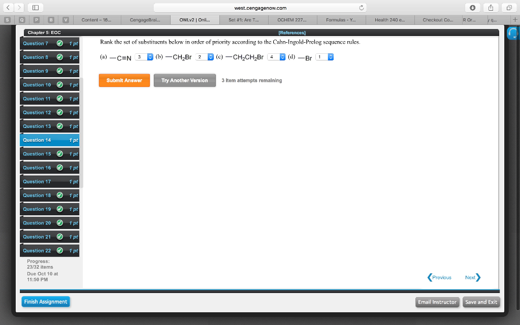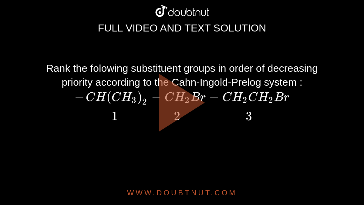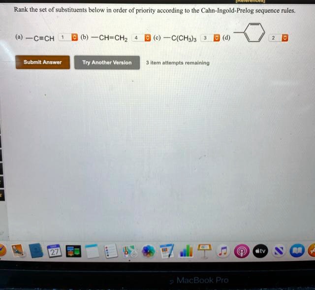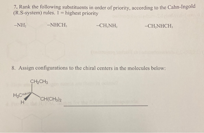 Answered: Rank the following substituents in… | bartleby Rank the following groups in order of decreasing priority. −CH=CH2, −CH3, −C≡CH, −H. Arrange the following group in order of increasing priority. Q) -OCH3 -CH (CH3)2 -B (CH2CH3)2 -H. Rank the set of substituents below in order of priority according to the Cahn-Ingold-Prelog sequence rules.1 = highest priority. Naming Complex Substituents — Organic Chemistry Tutor This also gives it precedence over the complex substituent for the numbering preferences since we don't have the more substituted atom in this cycle. So, the name for this compound is 1-ethyl-3- (1-methylbutyl)cyclohexane. Notice how we enclosed the complex substituent in the parentheses. Also, notice the punctuation.